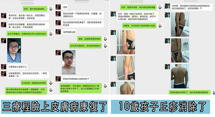 付先生:今年48歲,患濕疹有七八年了,整個背部幾乎看不到好的皮膚,奇癢難耐,白天工作就沒法安心的待在座位上,被領導責備了多次,更難受的是到了晚上,折磨的付先生難以入眠,翻來覆去,有時候拿頭在床上撞,長此以往,陷入惡性循環,身心受到多重傷害;經(百日剋癬湯)治療三週期後現在已經完全康復了,脫掉了癢癢皮,工作生活更加順風順水!