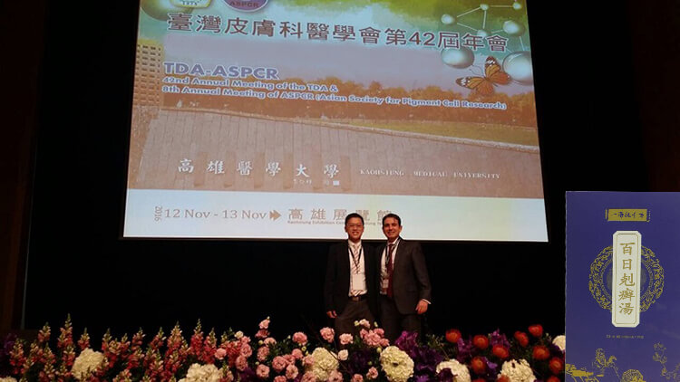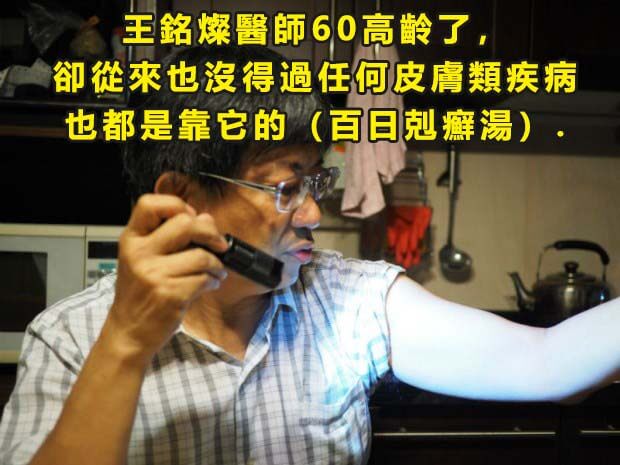 王銘燦醫師是個非常自信的人,他為了證明自己的(百日剋癬湯)的真實有效性,曾將此產品帶到臺灣皮膚科醫學會第42届年會上給權威專家試喝檢測,在大會上,有幾位老教授也是皮膚病患者,他們難忍新奇,當場試吃。結果吃上後,就覺得皮膚上就象有一-絲絲涼氣直往外冒,痛癢停止了,水皰幾分鐘後慢慢乾癟了,老教授們連呼神奇。